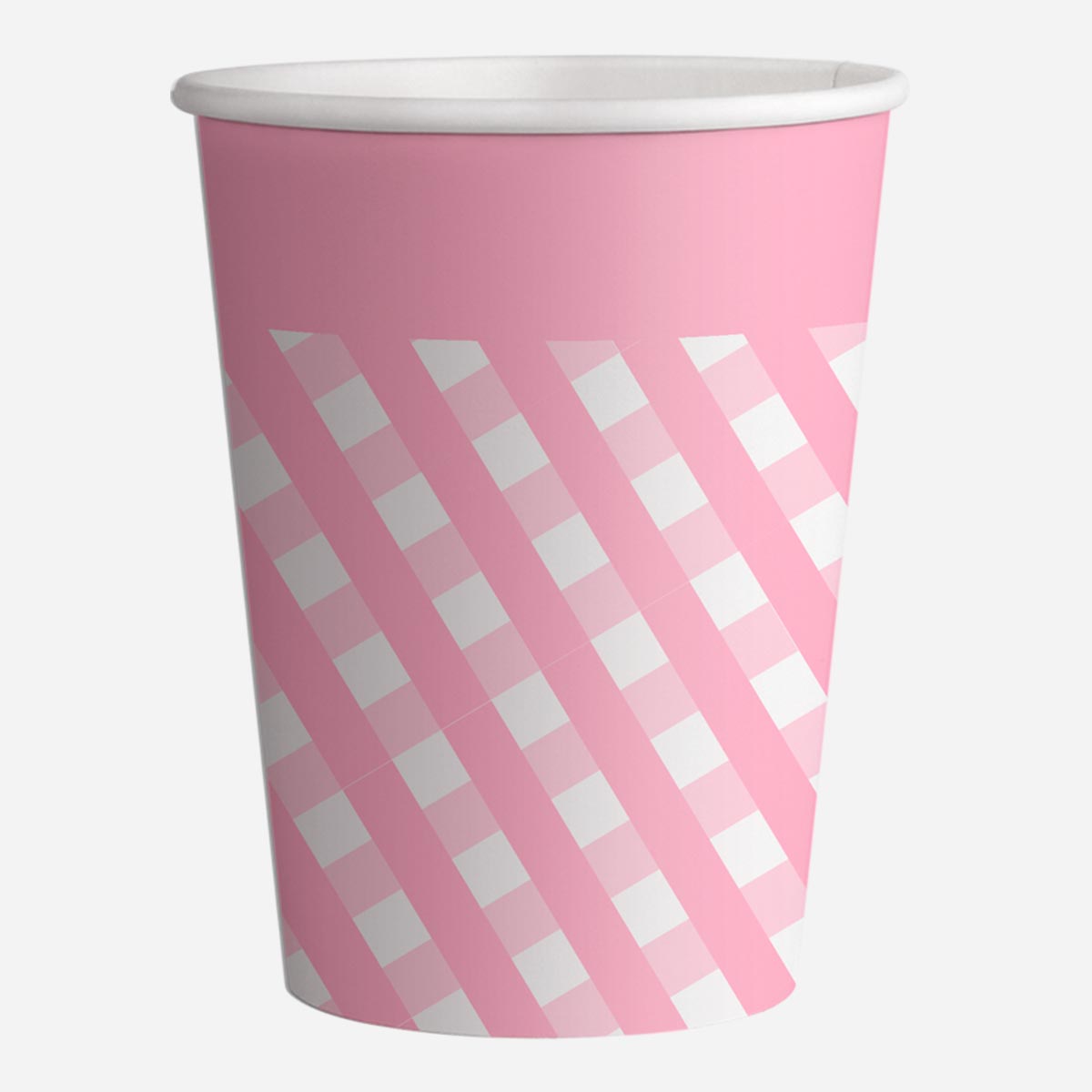 Bicchieri in carta con grafica quadretti rosa. Bicchieri per feste di compleanno e ricorrenze speciali. Ideale per feste a tema.
