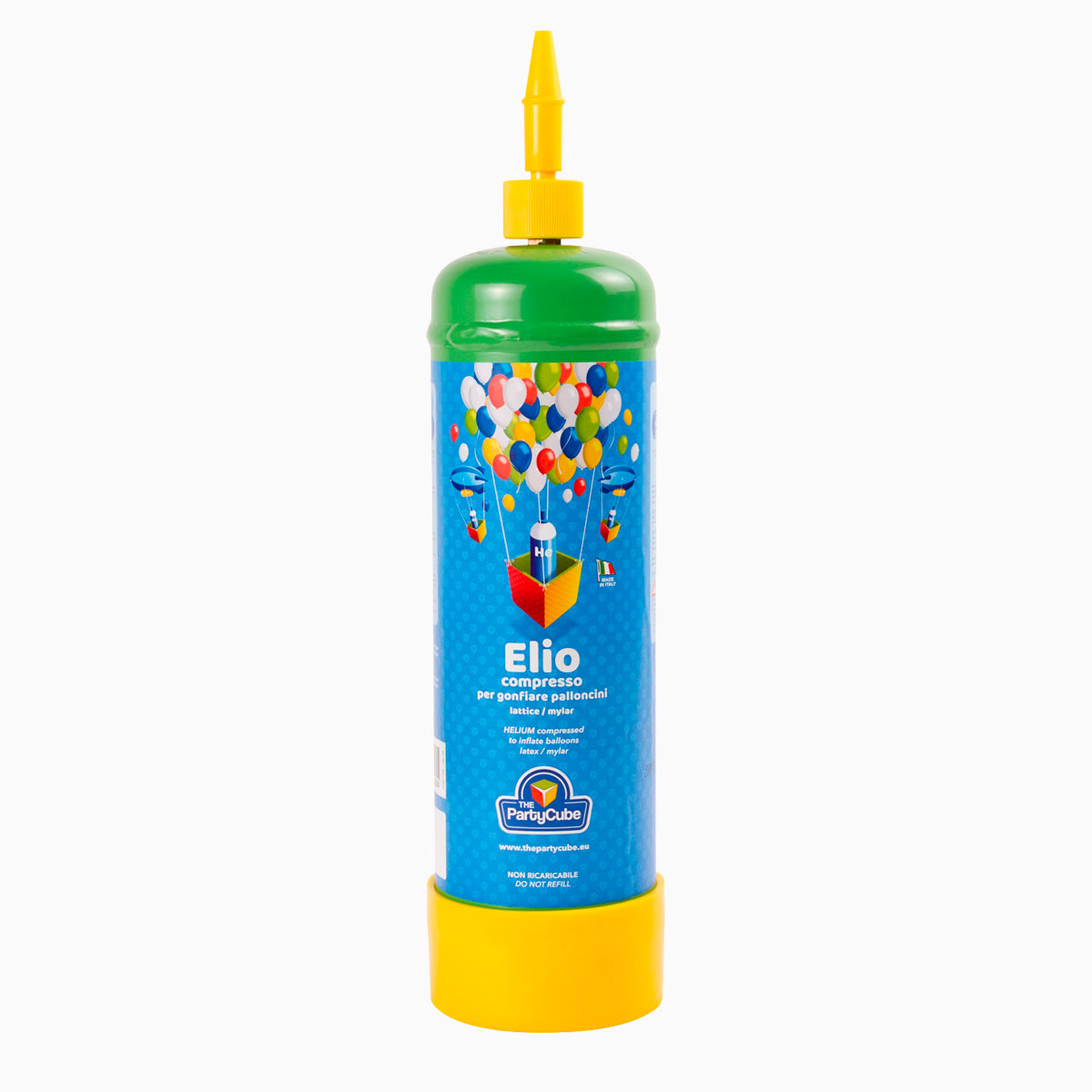 Bombola usa e getta Elio compresso da 2,2 litri. Bombola con grafica The Party Cube monouso per il gonfiaggio di palloncini per feste di compleanno e ricorrenze speciali.
