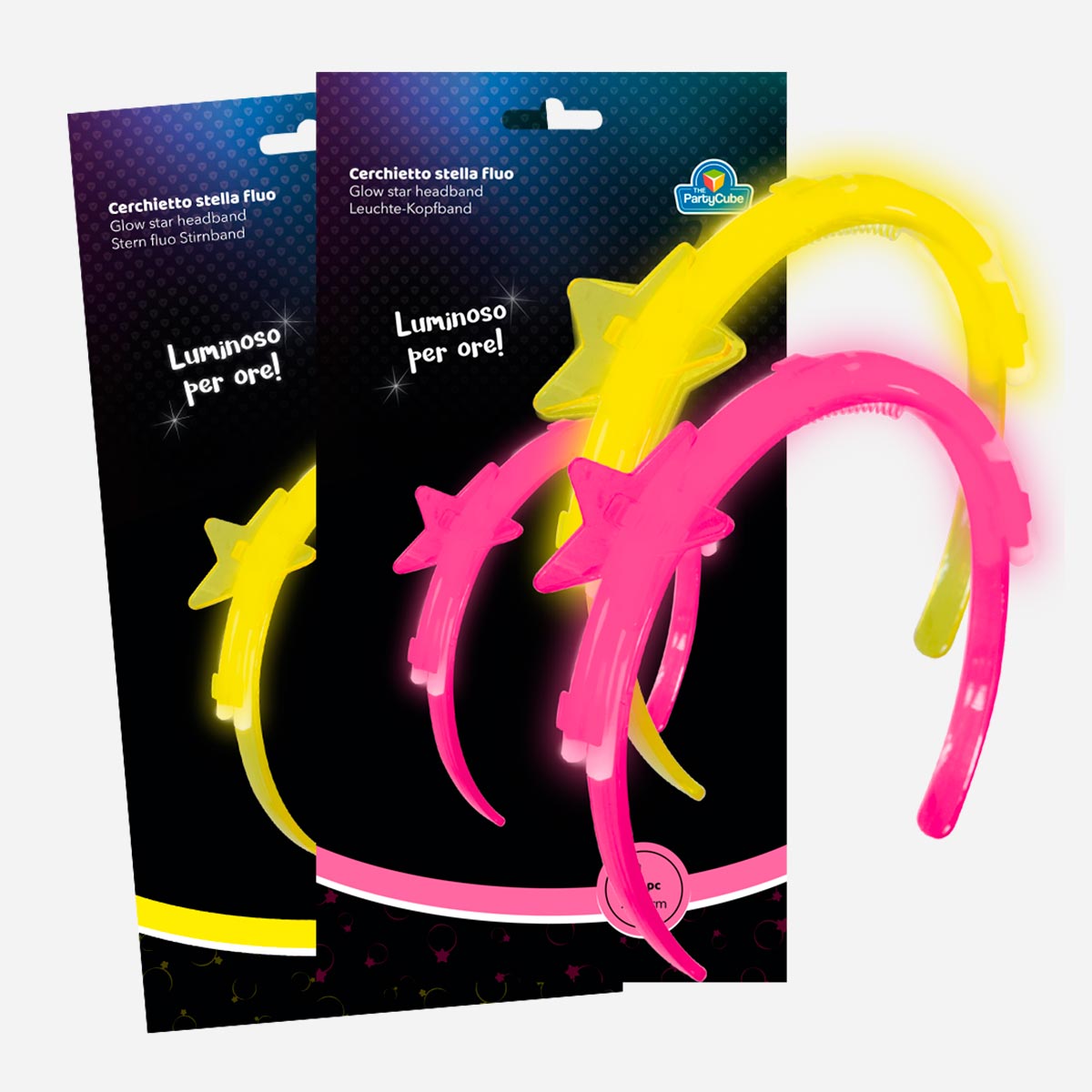 Cerchietto fluo colorato. Accessorio luminoso per feste di compleanno, eventi notturni e ricorrenze speciali. Luminoso per ore.