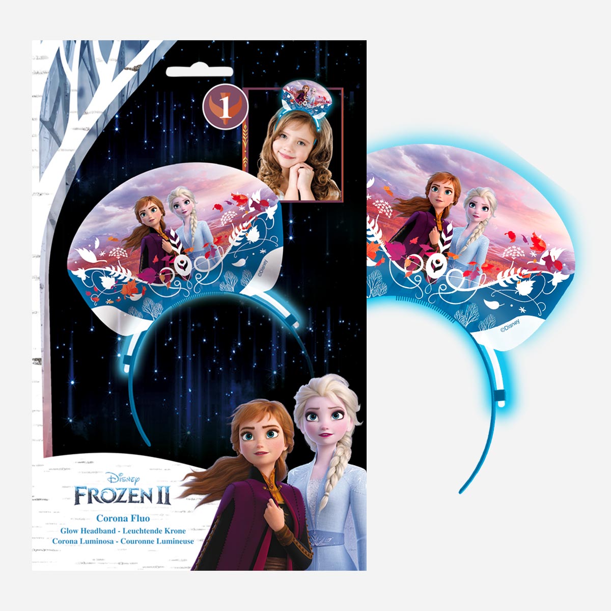 Corona fluo con grafica Disney Frozen 2. Accessorio luminoso per feste di compleanno e ricorrenze speciali. Luminoso per ore. Ideale per feste a tema personaggi della tv per bambini e ragazzi.
