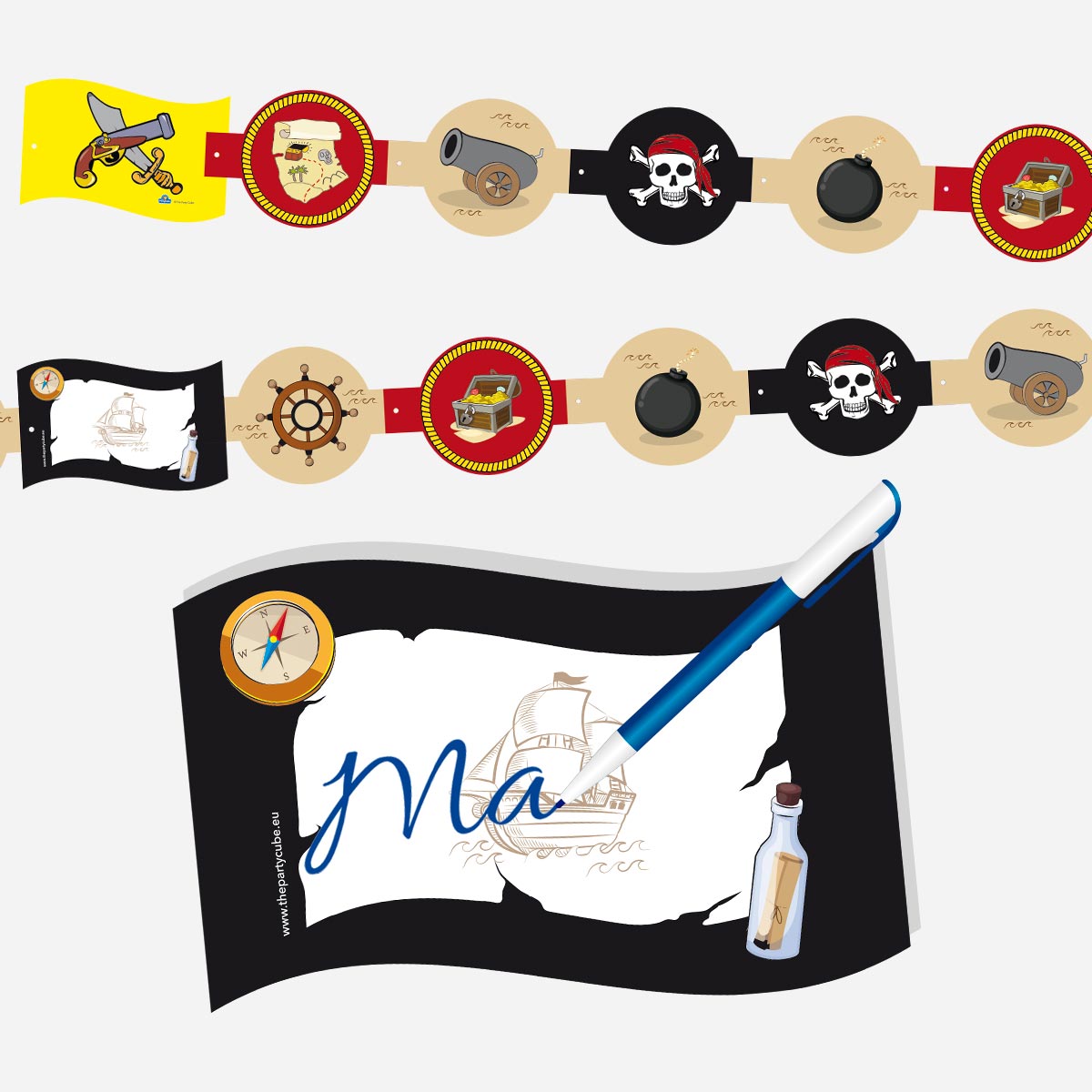Festone in carta con grafica pirati. Festoni per feste di compleanno e ricorrenze speciali. Sulla forma centrale è possibile scrivere il nome del festeggiato/a o altro. Ideale per feste a tema pirati. Festoni e decorazioni colorati per addobbi.