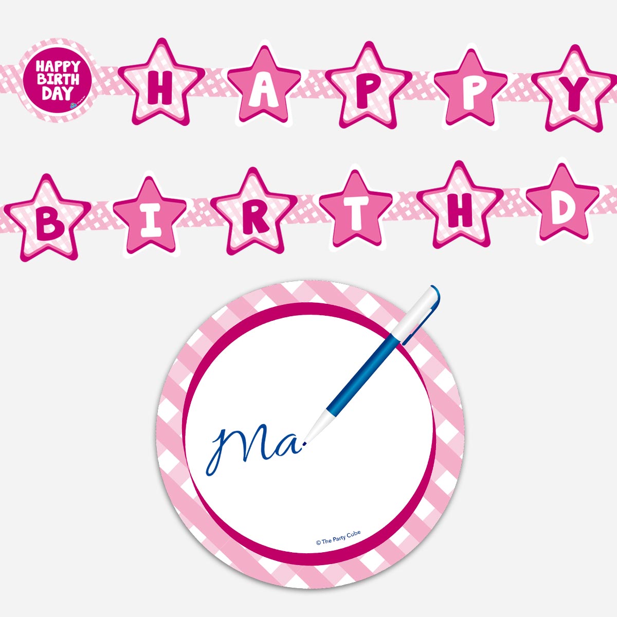 Festone in carta con grafica quadretti rosa. Festoni per feste di nascita, gender reveal e altre ricorrenze speciali. Sulla forma centrale è possibile scrivere il nome del bambino o altro. Festoni e decorazioni colorati per addobbi.