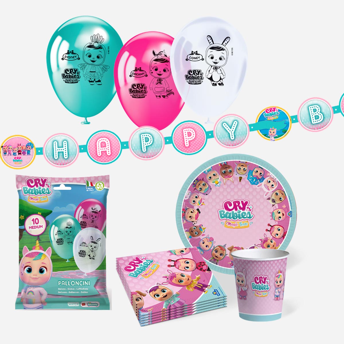 Kit festa con grafica Cry Babies. Prodotti party per feste di compleanno e ricorrenze speciali. Ideale per feste a tema personaggi della tv per bambini e ragazzi.
