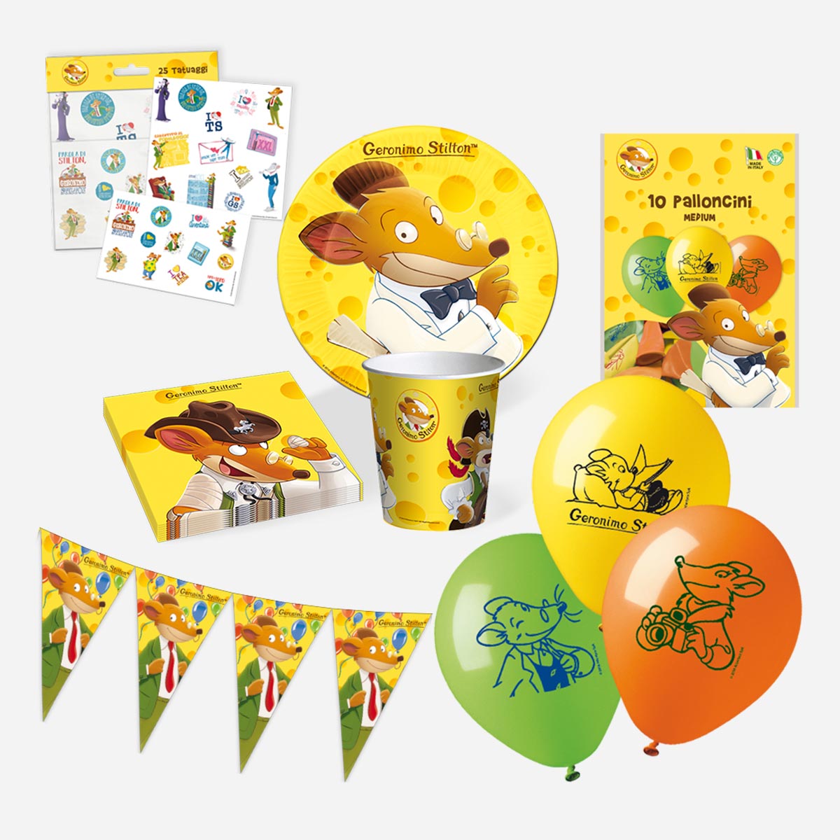 Contiene:2 confezioni piatti in carta bio 18 cm – 8 pz2 confezioni bicchieri in carta bio 250 ml – 8 pz2 confezioni tovaglioli in carta bio 33 cm – 20 pz1 festone bandierine in carta Geronimo Stilton1 confezione palloncini lattice Geronimo Stilton – 10 pz1 confezione tatuaggi Geronimo Stilton – 25 pz