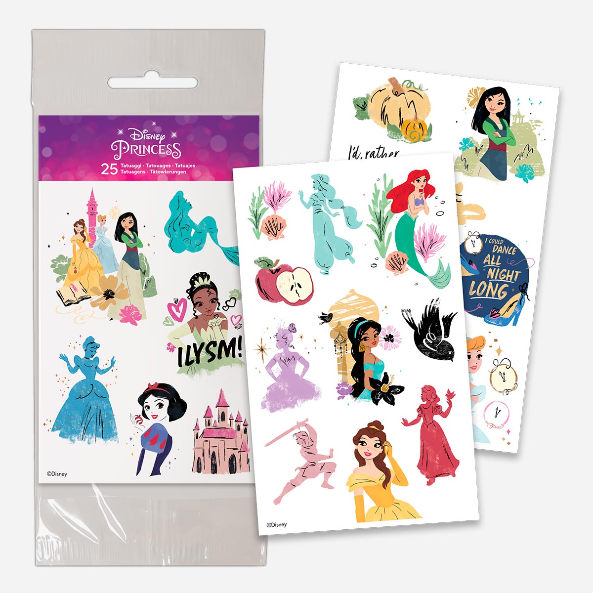 Tatuaggi temporanei ad acqua a tema Disney Principesse. Tatuaggi rimovibili, colorati e sicuri sulla pelle. Tatuaggi per bambini, da utilizzare per feste compleanno e altre ricorrenze speciali. Ideale per feste a tema personaggi della tv per bambini e ragazzi.