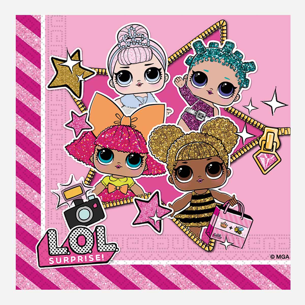 Tovaglioli in carta con grafica Lol Surprise. Tovaglioli per feste di compleanno e ricorrenze speciali. Ideale per feste a tema personaggi della tv per bambini e ragazzi.