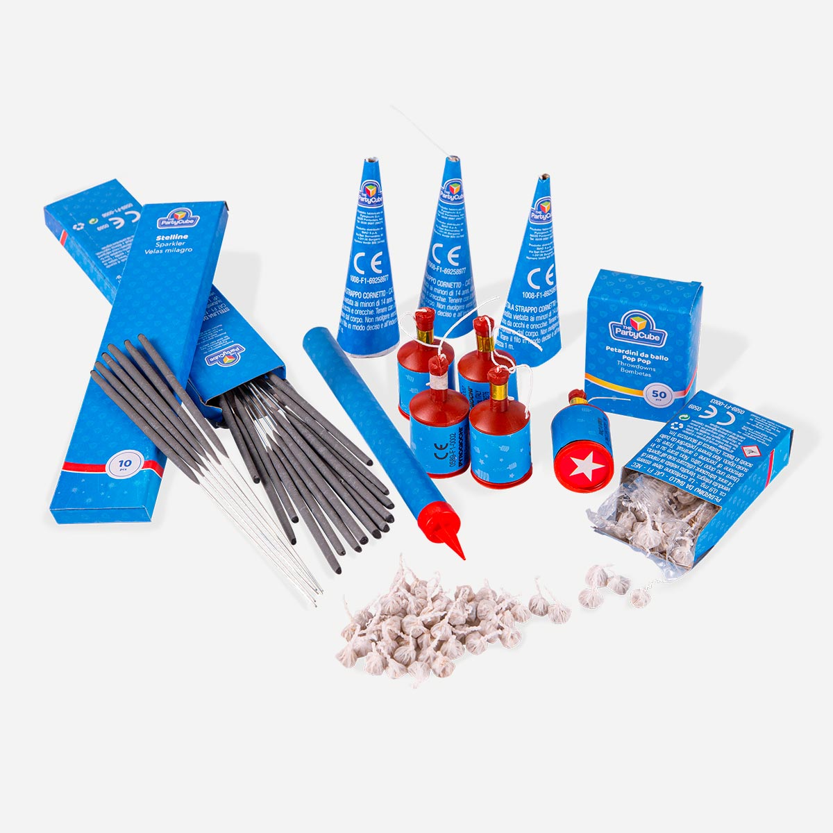 Contiene:20 stelline3 bottigliette a strappo100 petardini da ballo Pop Pop1 fontana da internoConfezione: 124 pezzi